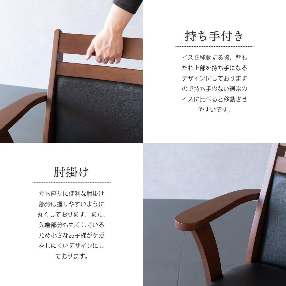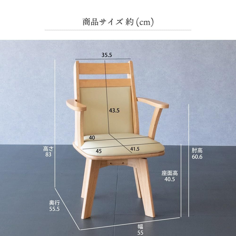 回転肘付きチェア】チェア単品の販売です。立ち座りしやすい360度回転するチェアは、両サイドにある肘置きで身体を支える事が出来るので、足腰への負担を減らし、立ち座りが楽にできます。座面にクッション性のある肉厚5cmのウレタン仕様で、座り心地も安心です。張地はPVCを使用していますので、汚れても簡単に拭き取ることができます。機能性にもこだわったチェアです。