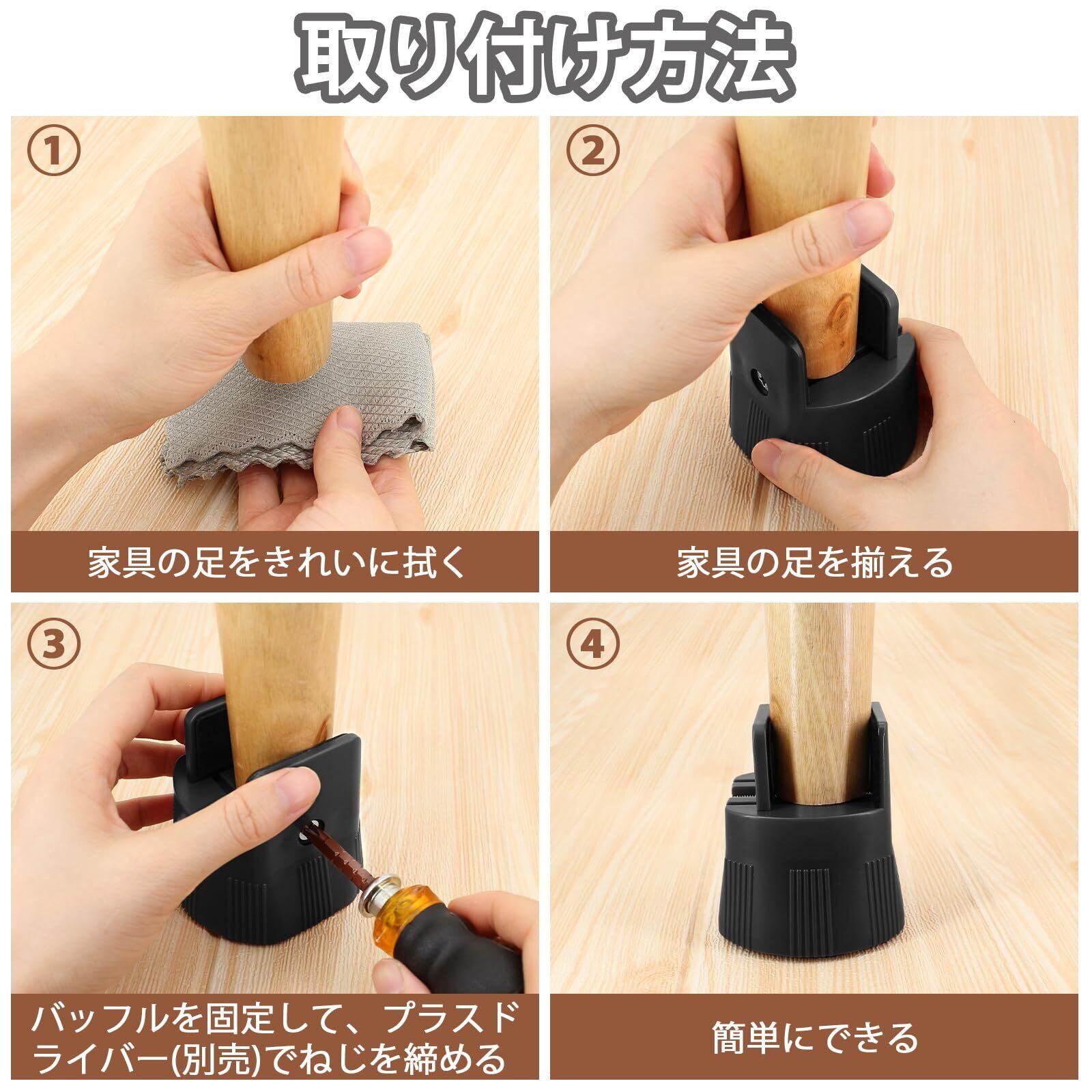 【巧みな設計】家具足のずれ落ちを防ぐするように小さなバッフル、締めネジを調節します。幅が0~5cm調節できるので、ほとんどの家電製品と家具の脚に相応しいです。また、バッフルと家具足の接続面にはやわらかいスポンジがデザインされ、傷つかないように家具足を保護します。●ご注意:ネジを締めて脚を固定するとき、プラスドライバー(別売)が必要です。