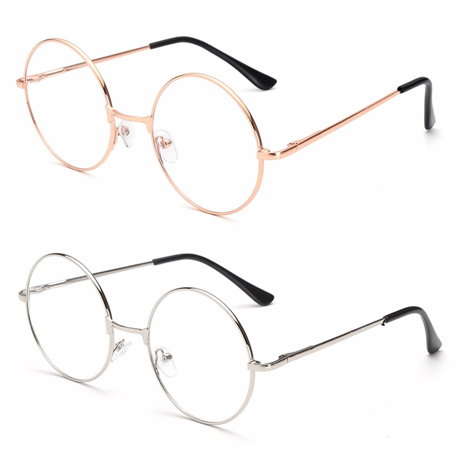 バッケージ】本製品はゴールドとシルバーグレー色の金属製の丸型メガネが2組含まれており、とてもおしゃれに見える。