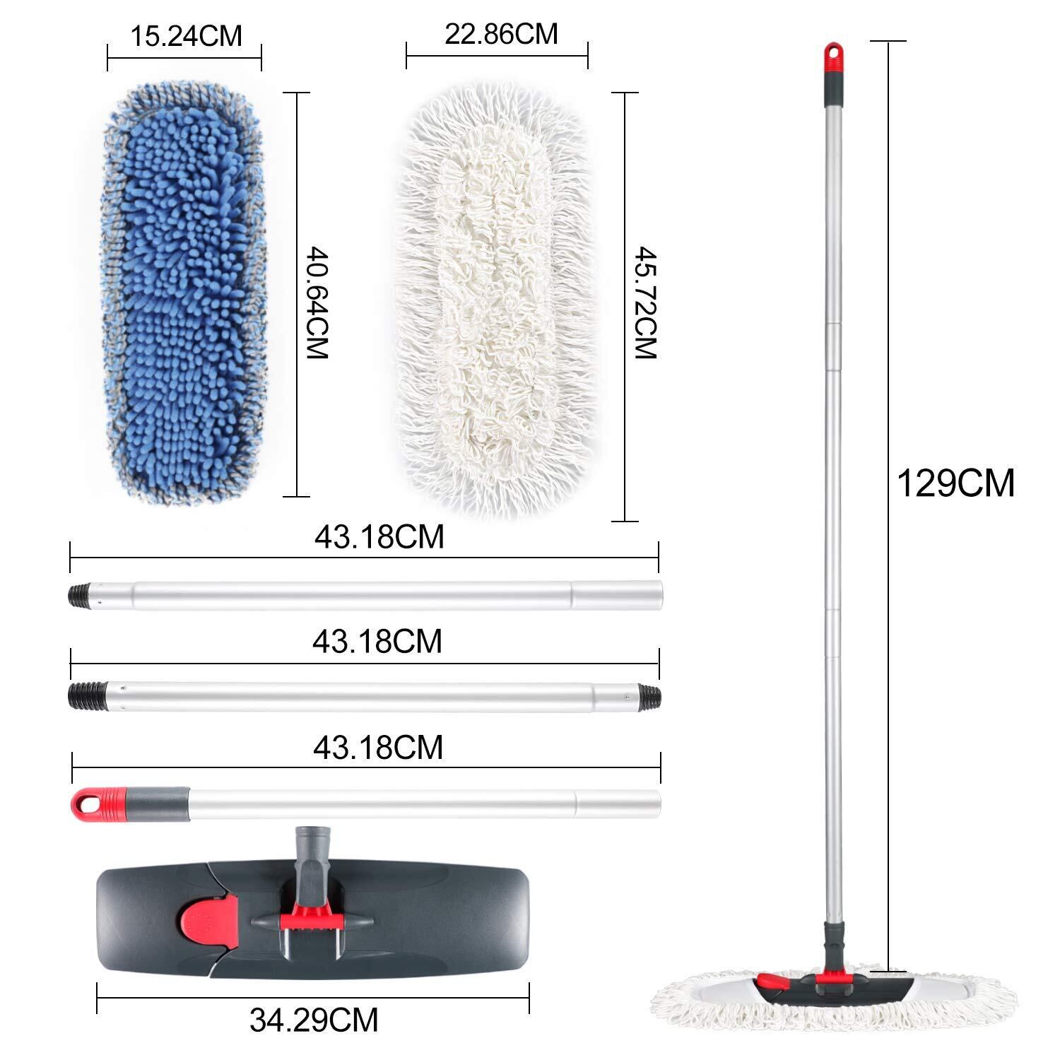 【フロアモップ詳細】ハンドル3本、取替用クロス2枚、ヘッド1個。 サイズ:34.5*86.5cm(ミドルポールを取り除く)(min)、34.5*129cm(max)