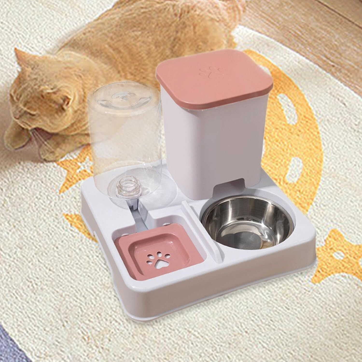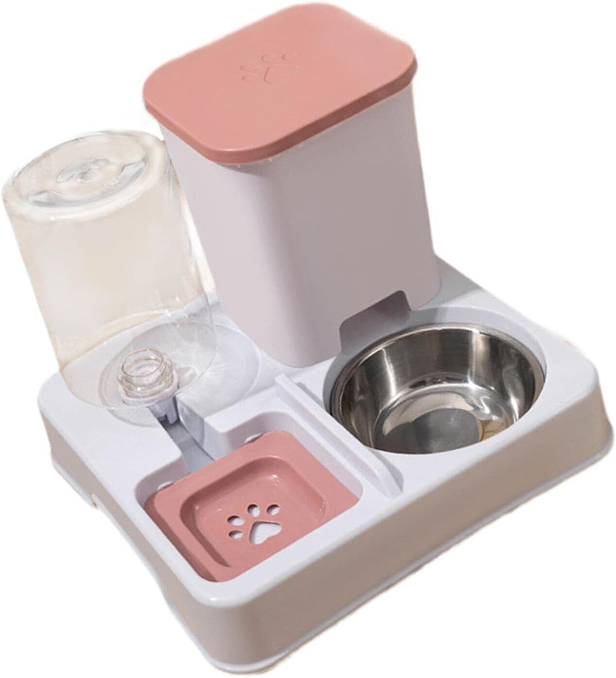Teguno-ペット用自動給餌用ボウル-自動給餌機 ペット用 2室式 ピンクホワイト – 飲水給餌一体型 サイフォン式 安定設計 全面脱着可能
