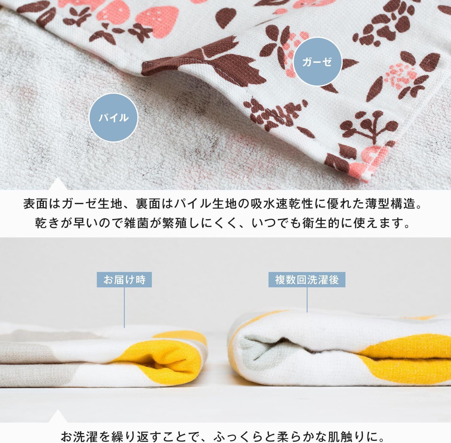 【ガーゼ素材】表はガーゼ素材で柔らかい肌触り。薄手だけれど裏はパイル生地でしっかりとした吸水性があります。