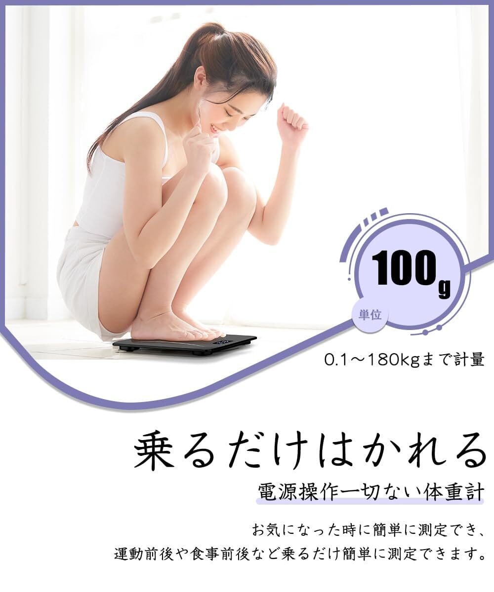 【高精度センサー・最大測定】四つの高精度センサーを搭載し、革新技術を利用しているので、体重をより正確に測定できる体重計。体重計デジタルは最大計量:180kg、最小表示単位:0.1kg単位として計算した 体重計 です。